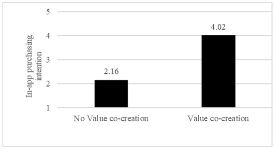 First, our independent sample test supported H1, that is, value co-creation increases consumers’ in-app purchasing intention. When participants were allowed to co-create the value in the game, their in-app purchasing intention is greater than when they were not allowed to do so when value co-creation did not exist (MValue co-creation = 4.02 vs. MNo value co-creation = 2.16, t(84) = 11.27, p < 0.001) (Figure 2).