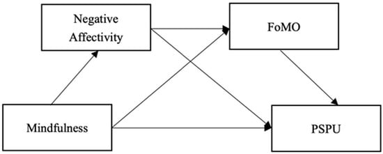 In addition, FoMO has been significantly associated with negative emotion. It has been suggested that FoMO could act as a mediator to link deficits in psychological needs with social media engagement [,]. In addition, large studies have confirmed the mediating role of FoMO in depression, anxiety, and PSPU severity. Some studies have found that loneliness is associated with boredom tendencies, which may drive FoMO and subsequent mobile phone use, so a new variable of loneliness was added to this study. FoMO is negatively correlated with psychological needs satisfaction; negative affectivity is a manifestation of basic psychological needs frustration. A recent study showed that FoMO mediates negative affectivity and PSPU []. According to the I-PACE model, response variables are considered to mediate relations between psychopathology and excessive Internet use, while FoMO is conceptualized as a response variable. Therefore, the present study hypothesized that negative affectivity and FoMO constitute a chain mediation between mindfulness and PSPU.