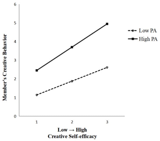 Watson et al. [47] defined positive affectivity as the degree to which an individual feels enthusiastic, active, and alert, and stated that positive affectivity implies that the individual is in a pleasant, active, highly focused, and engaged state. Studies have confirmed that optimistic and positive employees are more engaged and creative [48]. When working in a good emotional state, members are more likely to come up with new ideas, try new approaches, and be more flexible in solving problems or achieving goals. Based on the positive affectivity extension-construction theory, Fredrickson [49] argues that positive affectivity expands individuals’ cognitive range and motivates them to pursue novel and creative paths of thought and action, thus, the level of members’ positive affectivity can lead to differences in the effectiveness of creativity. Wang and Deng [50] also found that positive affectivity played a moderating influence in promoting members’ creative behaviors, and suggested that positive affectivity enhanced or slowed down individuals’ behaviors by influencing members’ creative self-efficacy. This paper concludes that the effect of creative self-efficacy on members’ creative behaviors may be moderated by the role of positive affectivity. Even members who have the same level of self-confidence in accomplishing creative work may differ in the performance or effectiveness of creative behaviors depending on the level of positive affectivity state they are in. A member in a high level of positive affectivity state experiences pleasure and pride when engaging in creative activities, which makes them more likely to be inspired to innovate, more confident to explore the feasibility of ideas, and more likely to produce more creative behaviors [51]. Thus, high levels of positive affectivity contribute to the perception of creative self-efficacy and will lead to more creative actions from creative self-efficacy. On the contrary, members in a low level of positive affectivity state, even though they are confident enough in their success in achieving creative actions, are not sufficiently engaged and easily distracted in conceiving ideas, which will make it difficult for them to catch a flash of inspiration and eventually lead to a low level of innovation. Therefore, this paper concludes that positive affectivity positively moderates the effect of creative self-efficacy on members’ creative behaviors and that the interaction between positive affectivity and creative self-efficacy has a significant positive effect on members’ creative behaviors, and gives the following assumptions: