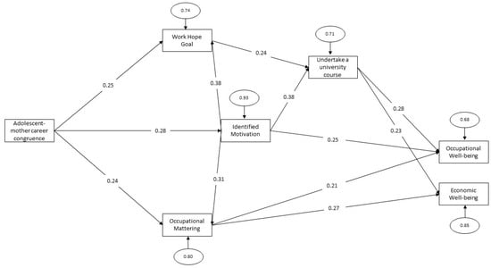 The results of the current investigation comply with the triadic structure of social cognitive career theory: person, behaviour and situation. Results highlight the impact of complementary adolescent–mother career congruence on work hope in the goal dimension, academic identified motivation and occupational mattering—adding value. The goal dimension of work hope and the identified academic motivation—as mediators—have a positive effect on the intention to undertake a university career. The identified academic motivation has positive impacts on work hope (goal dimension), occupational mattering—adding value and a direct impact also on occupational well-being. The occupational well-being as final outcome is also positively impacted by occupational mattering—adding value and by the personal future university enrollment intent. Moreover, there is an effect of both intention and occupational mattering—adding value on economic well-being.