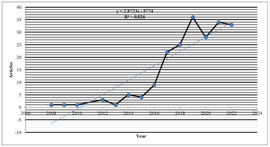 Similarly, Figure 2 shows the linear regression of variance with an explanatory effect coefficient of 82.6% for scientific publications per year, representing a positive relationship through the interpretation of [41,42], thus reflecting the validity and accuracy of the research topic.