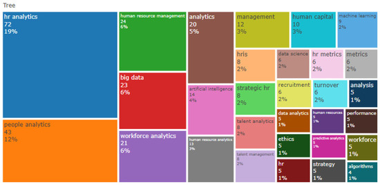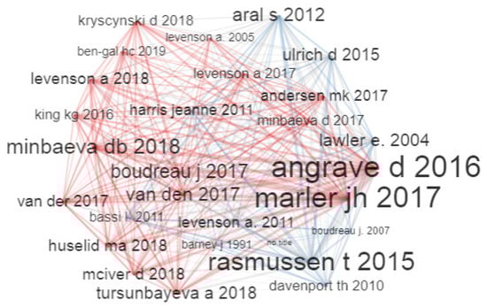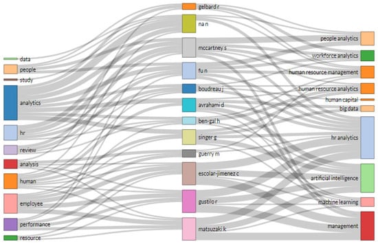 The thematic evolution of the keywords related to HR analytics and the most relevant authors on this topic a revisualised in the Sankey diagram [43] shown in Figure 3. This indicates the order of magnitude of the various information flows of the quantitative data for the main topics. The indexing of the content represents the redundant visualisation of the quantity of relationships with authors, highlighting the increased connection of the terms “HR analytics” and “Artificial Intelligence”.