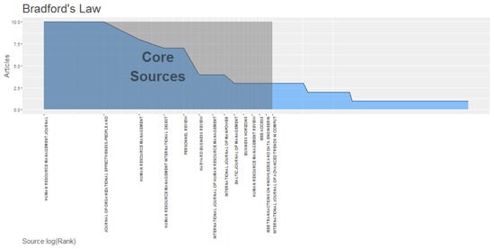 The most important journals on the topic of HR analytics can be identified by applying Bradford’s law [46] as shown in Figure 4. These core sources are identified in zone 1, the shaded area that includes the following journals: the Human Resource Management Journal and the Journal of Organizational Effectiveness: People and Performance. These journals are at the core [47] of HR analytics and include the most relevant research on the topic, so they should be given special importance when preparing publications on this subject.