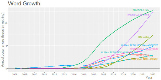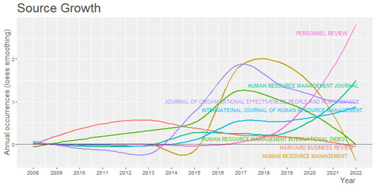In terms of the increase in publications, the journal Personnel Review stands out, showing exponential growth as seen in Figure 5. This growth commenced in 2019 and remains on the rise even in the first months of 2022. Included among the HR analytics research contained in this journal are the publications of [49,50].