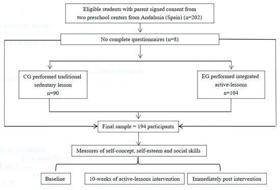 This is a longitudinal quantitative pre-post study with a control group (CG) and an experimental group (EG) that performed 30 min of integrated active lessons (2 days/week over 10 weeks). Twelve classrooms from two preschool centres in the south of Spain took part in this research, six classrooms were assigned as the EG and six as the CG. The EG and CG groups were equal and randomised within each centre.