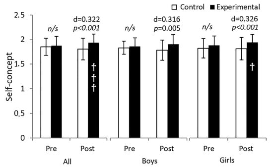 Other studies have shown that physical activity can help children achieve a positive self-concept through the improvement in physical perceptions and body satisfaction related to physical practice [25]. These authors show that BMI, body dissatisfaction or physical self-perception could be important for constructing an adequate self-concept through interventions based on physical movement. Murgui et al. [30] showed that better motor skills were linked to higher scores for self-concept, and Slutzky and Simpkins [26] also showed the positive effect of an exercise intervention on self-esteem. Some systematic reviews with metanalyses support the above results and conclude that exercise interventions improve self-concept and self-esteem in children, although they indicate that physical activity alone is less effective than integral interventions including physical activity and socio-cognitive aspects together [4].