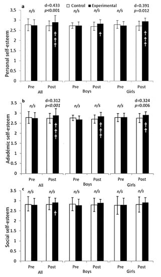 Analysis of 10 weeks of integrated active lessons programme based on playful maths games on personal, academic and social self-esteem of preschool children. (a) personal self-esteem; (b) academic self-esteem; (c) social self-esteem. † denotes p < 0.05; †† denotes p < 0.01; ††† denotes p < 0.001. n/s denotes non-significant.