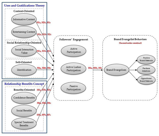 Moreover, the study by Rungruangjit and Charoenpornpanichkul [48] found that micro-influencer-generated content on Instagram can affect consumer–influencer engagements consisting of three dimensions: consuming (passive participation), contributing, and creating (active participation). This leads to sustainable consumer–brand relationships, including positive brand referral, purchase intention, and oppositional brand referral. Thus, it is expected that followers’ engagement also evokes brand evangelist behaviors. Thus, the following hypotheses were formulated to explore the correlation between followers’ engagement and brand evangelist behaviors:
