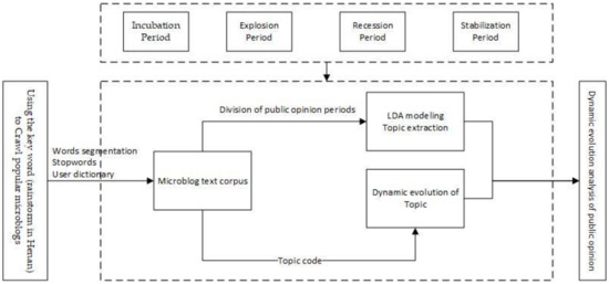 In order to better grasp the golden time after the occurrence of emergencies, gain the initiative, and reduce the severe consequences caused by emergencies, it is imperative to conduct a dynamic evolution analysis on public concern topics on social media platforms under the background of unconventional emergencies, which can provide a theoretical basis for public opinion decision making and analysis. In the literature, researchers divide the whole event into different communication cycles and summarize the public opinion themes in different periods [5,6,7] and finally give relevant policy suggestions or predict the event through modeling. In this way, dividing events into independent research often weakens the dynamic evolution process when the event development process is understood, and the event is studied from the time node after the emergency, meaning the focus is on how to avoid risks when similar events occur in the future, and exploring unconventional emergency events is not concentrated on. Solomon et al. [8] note that it is difficult to stop a pandemic when it breaks out, and the best way to do so is to identify danger signs as soon as they appear. And, the dynamics of social information in the early stages provide a critical perspective. Therefore, tapping into the potential of emergency events, preparing accordingly in advance, and reducing the damage caused by emergency events is a new perspective worth studying.