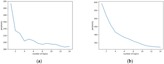 Since the number of topics in the LDA model needs to be set artificially, this paper selected the confusion index to judge whether the selection effect of the number of topics was optimal. Based on the comprehensive performance of the perplexity curve in four periods, the final number of topics was selected as 8. In addition, the selected number of topics achieved a good differentiation effect and did not overfit. The confusion curves for the four periods are shown in Figure 3a–d. The formula for calculating the confusion degree is shown in Equation (2). The selection of the number of topic words needs to be discussed based on specific events. Chen et al. [24] selected the top 20 theme words with the highest probability of occurrence to reflect the thematic characteristics of hot social events in different periods. Feng et al. [27] chose the top 10 words as the characteristic words of the subthemes in each time slice. Xie et al. [29] selected the top 30 most salient words to be displayed visually as theme words. In this paper, when determining the number of topic words, 30 topic words were finally selected. The number of iterations was set to 300, and the hyperparameters were set to α = 0.01 and β = 0.05. After the parameters were set, the microblogging text corpus was input, and the LDA topic model program was run.