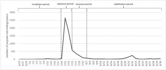 The time series distribution of popular microblogs related to the “Henan rainstorm” is shown in Figure 4. Based on the trend of "single peak" in the number of popular microblogs, this paper divided the cycle of public opinion dissemination into four phases: the incubation period (25 June 2021 to 19 July 2021), the explosion period (20 July 2021 to 24 July 2021), the recession period (25 July 2021 to 2 August 2021), and the stabilization period (3 August 2021 to 30 August 2021).