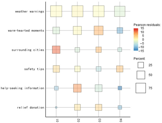 To sum up, the text topics in the explosion period were more diversified, with new themes of “help-seeking information” and “relief donation” appearing as the event developed in addition to the themes of “weather warning” and “warm-hearted moment” that already appeared in the incubation period.