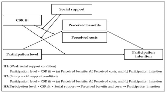 In summary, social support drives consumers to pursue social goals and decreases their perception of costs. Applying this to the context of participatory CSR, it is expected that the interaction effect of the participation level and CSR fit on perceived benefits and costs will be different due to social support. First of all, if social support is not activated, the influence of the participation level on consumer perception will depend on the CSR fit. As mentioned earlier, when there is a high CSR fit, consumers perceive the level of participation as the size of the benefit. As a result, they have a positive intention to participate in CSR, judging that the benefits increase as the level of participation increases. However, when the CSR fit is low, the level of participation is perceived as the size of the cost, judging that the higher the level of participation, the higher the cost, resulting in a negative intention to participate in CSR. Based on the above discussion, the following hypotheses were derived.