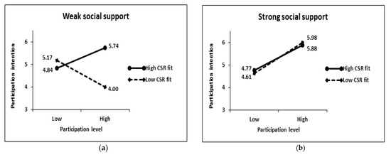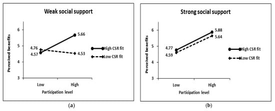 In the group in which social support is not activated, the influence of the level of participation on consumers’ responses (perceived benefits, perceived costs, and participation intention) is changed by the CSR fit.