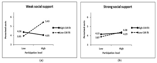 Interaction effects on perceived costs: (a) Weak social support condition; (b) Strong social support condition.