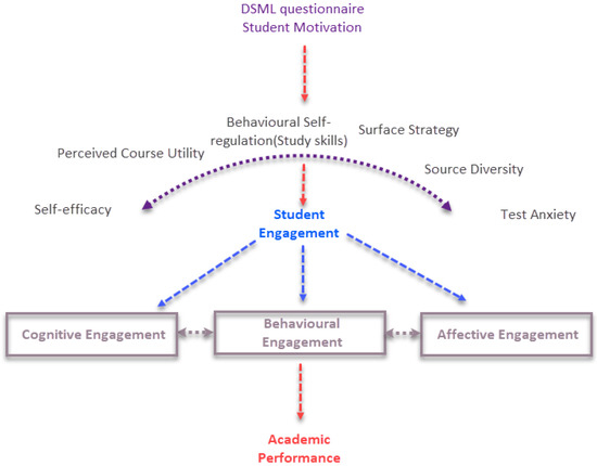 The six key elements of the DSML questionnaire are connected to student engagement and academic performance (Figure 2). Although many researchers have confused motivation with student engagement, student engagement arises from motivation [70,71]. As student engagement is highly related to motivation, the six elements that emerge from this study could be blended with the most widely used student engagement frameworks that support cognitive, affective and behavioral dimensions [72]. The proposed short questionnaire could support studies on student engagement and academic performance, such as a recent study on the COVID-19 pandemic [73].