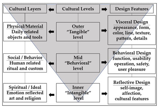 The three layers and levels of cultural objects and design features. Adapted with permission from Ref. [14]. 2007, Rung-Tai Lin.
