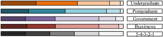 - Taking the campus of the Henan University of Technology and the central area of Zhengzhou city as the survey sites, the questionnaire was designed using the Likert five-level scale method, and the reliability and validity of the questionnaire were tested. The recovered data can meet the requirements of SEM analysis, and ensure the consistency and reliability of the results. At the same time, this paper analyzes the individual differences in respondents’ BS travel willingness and explores the differences in BS travel willingness among undergraduates, graduate college students, business personnel, and civil servants;