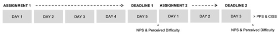 Overview of the study procedure: Participants were asked to summarize two academic articles in two different sessions. The deadline for the first session was set to 5 days, whereas that for the second session was set to 3 days. The NPS and a set of items for assessing the perceived difficulty of the task were administered after each session. The PPS and the CISS questionnaires were administered at the end of the study.