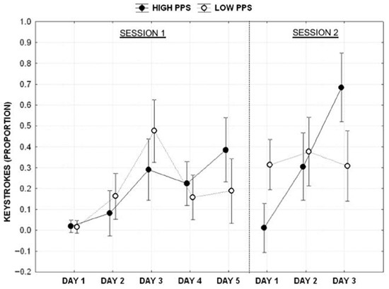 The proportion of keystrokes (angular transformation) produced by the participants was used as a dependent variable in a mixed ANOVA design employing the procrastination profile (Low vs. High) as a fixed factor and the day of writing (Day 1 vs. Day 2 vs. Day 3 vs. Day 4 vs. Day5 ) as a repeated factor. The results showed no significant effect of the profile (F1,53 = 3.102, p > 0.05), the significant main effect of the day (F4,212 = 9.485, p < 0.001, ηp2 = 0.152) and the significant interaction between the profile and day (F4,212 = 2.879, p < 0.05, ηp2 = 0.051). Post hoc analyses (Duncan test) of the interaction showed that the two groups were significantly different on Day 3 and Day 5, respectively. Specifically, low procrastinators showed a peak of performance on Day 3, whereas the high procrastinators showed a peak of performance on Day 5.
