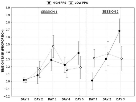 The same analysis was performed using the day of writing for the 3-day deadline condition (Day 1 vs. Day 2 vs. Day 3) as a repeated factor. The results showed no significant effect of the profile (F1,53 = 0.963, p > 0.05), the significant main effect of the day (F2,106 = 7.274, p < 0.001, ηp2 = 0.121) and the significant interaction between the profile and day (F2,106 = 7.811, p < 0.001, ηp2 = 0.128). A post hoc analysis (Duncan test) of the interaction revealed that low procrastinators consistently performed during the three days with no statistically significant difference between days. In contrast, the high procrastinator group showed a significant linear increment across work days from the first to the third (Figure 2).