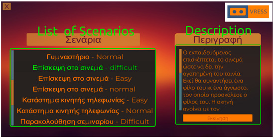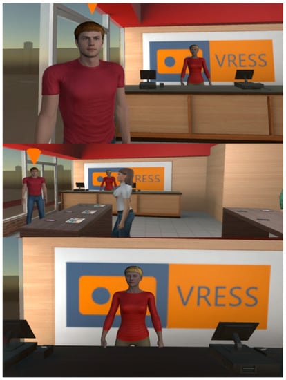 The VR Enhancement of Social Skills (VRESS) was developed in line with the guidelines for developing VR software for research and clinical applications in the field of psychology [71]; these guidelines have been found to produce VR software that meets the criteria of the American Academy of Clinical Neuropsychology (AACN) and the National Academy of Neuropsychology (NAN) [72]. VRESS incorporates social scenarios that are exemplary of adult activities and common in daily life, such as renewing one’s subscription to the gym, selecting a movie and buying a ticket at the cinema, browsing the available options and purchasing a smartphone at the phone store, attending a seminar class and interacting with the instructor and the co-students, and attending a job interview and responding to the interviewers’ questions. The social scenarios were designed in line with the guidelines of Gray and Garand [73] for providing social stories that provide individuals with ASD (i.e., the learners) a visual representation and a description of a situation or activity to prepare and instruct them on what to expect, as well as the underlying reasons for this matter. Thus, the social scenarios of VRESS are descriptive rather than directive. The social stories were designed for individuals with ASD to comprehend and apply the intricacies of interpersonal communication to interact more appropriately and effectively. The social story approach provides the opportunity for people with ASD to identify the context, discuss their motives, comprehend the amplifiers or the obstacles, and improve their social skills [73,74].