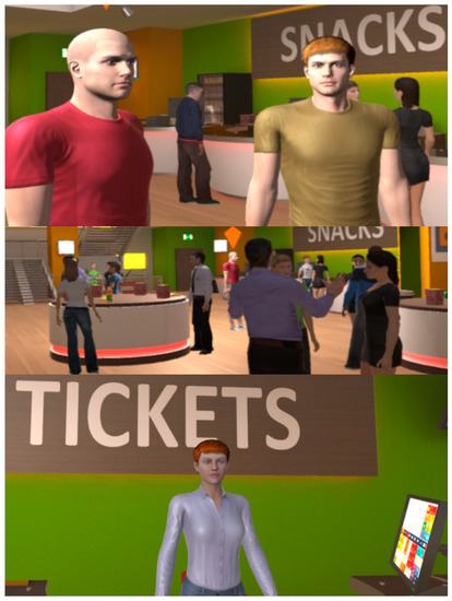 At the cinema (see Figure 5), the trainee has to select a movie and buy a ticket for this movie. At the easy level, while having a specific movie in mind, the trainee arrives late at the cinema, and they need to browse their options (e.g., the next showing or another movie) and buy a ticket. At the moderate level, while having an appointment with a friend, the examinee arrives late, and they need to apologise and then buy tickets for the movie. At the difficult level, while having an appointment with a friend and another person (a friend of the friend), they need to meet them, introduce themselves, discuss finding the way to the cinema and film genres that they like, then choose a movie, and finally buy tickets for everybody.