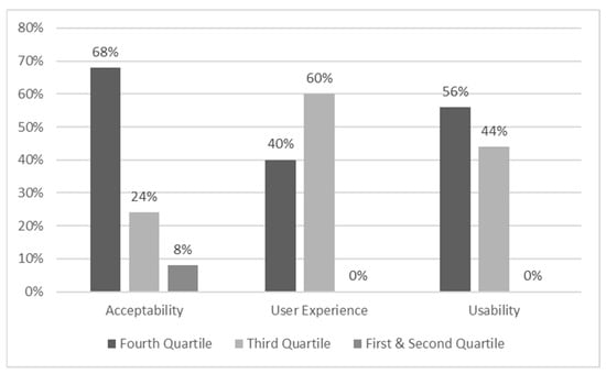As Table 1 and Figure 9 illustrate, the vast majority of participants reported very high acceptability of using immersive VR training as a social/health service. A total of 68% of the responses were in the highest quartile, indicating substantially high acceptability. Notably, 92% of the participants’ responses had an overall score above the medium scores of SUTAQ (i.e., 66), which indicates a very high rate of acceptability [103]. For user experience, the majority of responses were in the third quartile (see Figure 9), while all the responses were above the medium score. These scores indicate a high to very high user experience [90,104]. Comparably, 100% of the respondents gave scores in the third and fourth quartiles of the possible scores (see Figure 9), which indicates good to excellent usability [92]. Likewise, both the mean and standard deviation of the usability scores (see Table 1) of VRESS indicate a very good to excellent usability rating [92].