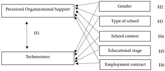 While the use of technology offers flexibility and simplifies certain processes, it has also exacerbated the problem of technological stress. Furthermore, the use of ICT can sometimes pose a threat due to its misuse or overuse, resulting in technostress—something that has been more evident in the last ten years, presenting itself as an occupational risk challenge [,]. Moreover, as discussed in the theoretical framework, technostress is related to perceived organizational support. This contributes to job satisfaction by conveying to employees that help and support are always available []. Therefore, this study proposed six hypotheses for analyzing both the relationship between technostress and perceived organizational support in teachers (Hypothesis 1) and the influence of certain socio-demographic variables on this relationship (Hypotheses 2 to 6: gender, type, and setting of school, educational stage, and type of employment contract).