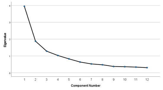 Using Principal Component Analysis, four main factors were obtained that had an Eigenvalue > 1, explaining a cumulative variance of 67.86%. A scree plot confirms the findings of the four retained factors (Figure 1).