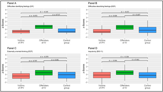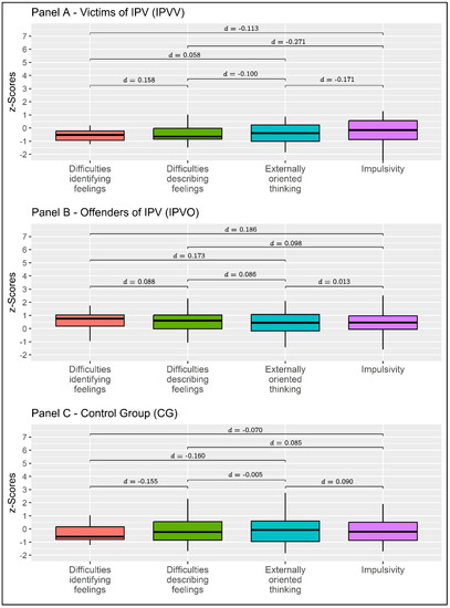 Considering IPVV individuals, a non-statistically significant multivariate effect was found: Pillai’s V = 0.063, F = 0.401, p = 0.754, η2p = 0.063 (moderate effect size). Considering IPVP individuals, a non-statistically significant multivariate effect was found: Pillai’s V = 0.110, F = 905, p = 0.455, η2p = 0.110 (moderate effect size). Lastly, considering individuals from the CG, a non-statistically significant multivariate effect was found: Pillai’s V = 0.036, F = 0.341, p = 0.769, η2p = 0.036 (small effect size). Detailed results—bivariate comparisons—are reported in Table 3 and Figure 3.
