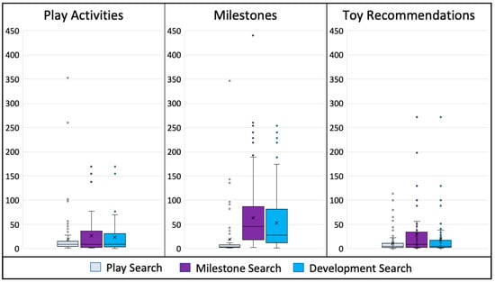 Number of play activities, milestones, and toy recommendations identified in the content from the Play, Milestone, and Development Searches. Box and whisker plots with the horizontal line denoting the median, X indicating the mean, and the bottom and top borders of the box representing the first and third quartiles. The whiskers extend to the minimum and maximum values while additional points indicate outliers that are greater than 1.5 times the interquartile range.