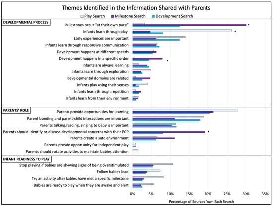 The themes identified in the content regarding developmental process, parents’ roles, and infants’ readiness to play can be seen in Figure 2. Among the developmental process themes, three varied in relation to the search type. There was a significant relation between the type of search and the presence of information stating that milestones occur at their own pace (X2(2) = 35.20, p < 0.001). Post-hoc analyses identified that sources from the Milestone Search were more likely to include this theme (Z = 5.61, p < 0.001), while sources from the Play Search were less likely to include it (Z = −4.6, p < 0.001). There was also a significant relation between the search type and the theme that infants learn through play (X2(2) = 28.78, p < 0.001), which was more likely to be present in sources from the Play Search (Z = 5.31, p < 0.001) and less likely to be present in sources from the Milestone Search (Z = −3.43, p < 0.001). Further, there was a significant relation between the search type and content about development occurring in a specific order (X2(2) = 9.75, p = 0.008), with post-hoc analyses identifying that sources from the Milestone Search were more likely (Z = 2.63, p = 0.009) and sources from the Play Search were less likely (Z = −2.83, p = 0.005) to discuss this.