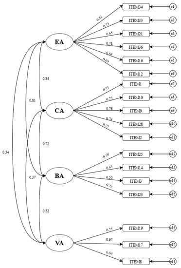 The confirmatory factor analysis model of FLAS. Note. EA = emotional absence; CA = cognitive absence; BA = behavioral absence; VA = volitional absence.