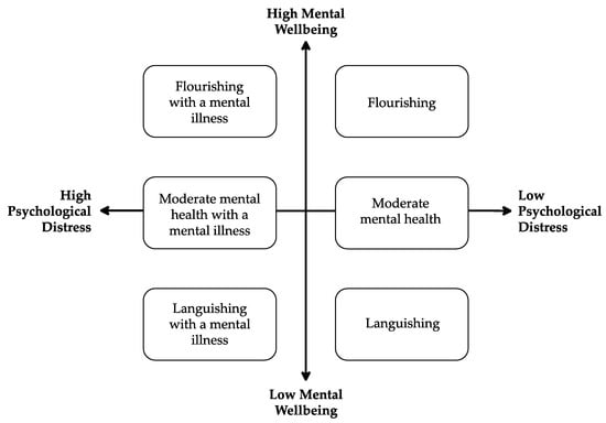 Whilst an abundance of studies investigating mental illness and mental wellbeing have independently progressed our understanding of the human experience, it was not until more recently that scholars began to explore how “symptoms” of illness and wellbeing might interact to collectively contribute to one’s overall mental health [11]. Such enquiry ultimately led to criticism of the implicitly applied and largely untested bipolar conceptualisation, whereby mental illness seamlessly flows into mental wellbeing on a single continuum. Accordingly, several alternative explanations were offered, with the dual-continua model of mental health, as outlined by Keyes [12,13], being one of the most prominent alternative models.