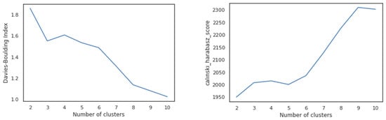 We used dimensionality reduction techniques, specifically Principal Component Analysis (PCA), to determine that nine components constituted the optimal number for predicting the output variable. We then evaluated these nine components using the silhouette, Calinski–Harabasz, and Davies–Boulding index scores (as shown in Figure 3) to determine the optimal number of clusters. The scores favored the average similarity measure of each cluster with its most similar cluster and, as the resulting number of clusters was substantial, we decided to proceed with nine clusters.