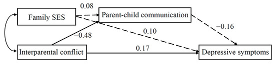 Figure 2. The path-analytic model depicting relations among interparental conflict, family SES, parent–child communication, and depressive symptoms in children with a low level of peer attachment. Note. The full arrow is the significant path; the dashed arrows are the nonsignificant paths. The values were standardized path coefficients.