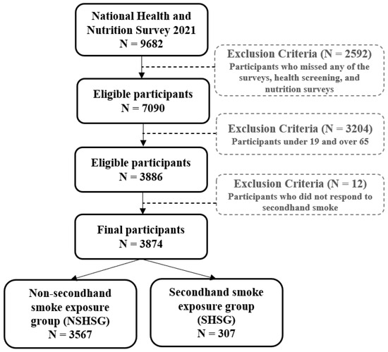 This study was conducted based on the annual KNHNES by the Korea Disease Control and Prevent Agency. In the 8th survey, there were 9682 subjects in the third year (2021), 7090 participants participated in one or more of the health survey, examination survey, and nutrition survey, and the participation rate was 73.2%. A total of 3886 people, aged 19 to 65, were extracted in accordance with the purpose of this study, and the final 3874 subjects were selected, excluding missing values for exposure to SHS in public places (Figure 1).