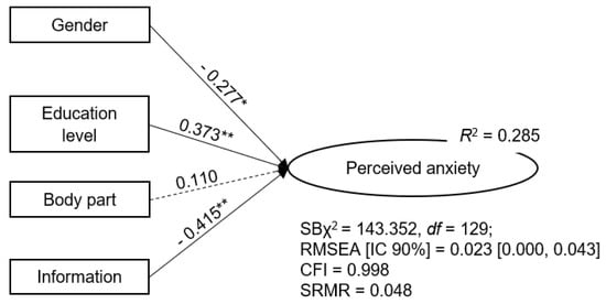 The objective of study one was to explore the predictive influence of having received information from the prescriber about the procedure and body part examined (contextual variables), as well as gender and EL (individual variables) on PA in MRI. We expected that being female (e.g., [34]), having lower education (e.g., [36]), and not receiving information about the procedure (e.g., [49]) would be predictors of PA. As for the body part examined, we expected the head MRI to be the best predictor of PA. The MIMIC model shows that 28.5% of PA is predicted by gender, EL, and information from the prescriber. Body part examined is, against expectations (e.g., [22,26]), not a predictor of PA.