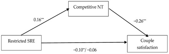 The third model included a restricted sense of relational entitlement as the predictor, the use of competitive negotiation tactics as the mediator and couple satisfaction as the outcome (see Figure 1). Restricted entitlement had a significant effect on the mediator (β = 0.16; p < 0.001). Its total effect on the outcome was also significant (β = −0.10; p = 0.005). Using competitive negotiation tactics had a significant effect on couple satisfaction (β = −0.26; p < 0.001). The indirect effect of the sense of restricted entitlement on couple satisfaction was significant (β = −0.04; CI (−0.06; −0.02)), but its direct effect became non-significant after the introduction of the mediator (β = −0.06; p = 0.09). As for the control variables, some significant effects were found. The participants’ gender had negative effects on the use of competitive negotiation tactics (β = −0.11; p = 0.004) and couple satisfaction (β = −0.16; p < 0.001). Additionally, their relationship duration had a negative effect on couple satisfaction (β = −0.09; p = 0.02), while their cohabitation status had a positive one (β = 0.11; p = 0.006).