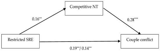 In the fourth model, couple conflict was used as an outcome (see Figure 2). Restricted entitlement had a significant total effect on the outcome (β = 0.19; p < 0.001). Using competitive negotiation tactics had a significant effect on couple conflict (β = 0.28; p < 0.001). The indirect effect of the sense of restricted entitlement on couple conflict was significant (β = 0.04; CI (0.02; 0.07)), as well as its direct effect after the introduction of the mediator (β = 0.14; p < 0.001). The participants’ cohabitation status had a negative effect on couple conflict (β = −0.08; p = 0.04).