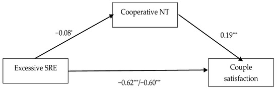 Total and direct effects of excessive sense of relational entitlement (SRE) on couple satisfaction, with cooperative negotiation tactics (NT) as mediator. The values represent standardized regression coefficients. On the path between excessive SRE and couple satisfaction, the first value represents the total effect and the second value represents the direct effect. The effects of the controlled variables (age, gender, relationship length and cohabitation status) are not presented for brevity. * p < 0.05; *** p < 0.001.