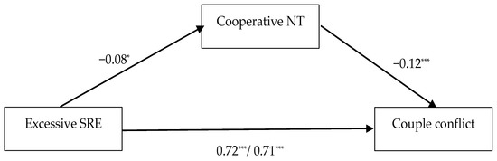 Total and direct effects of excessive sense of relational entitlement (SRE) on couple conflict, with cooperative negotiation tactics (NT) as mediator. The values represent standardized regression coefficients. On the path between excessive SRE and couple conflict, the first value represents the total effect and the second value represents the direct effect. The effects of the controlled variables (age, gender, relationship length and cohabitation status) are not presented for brevity. * p < 0.05; *** p < 0.001.