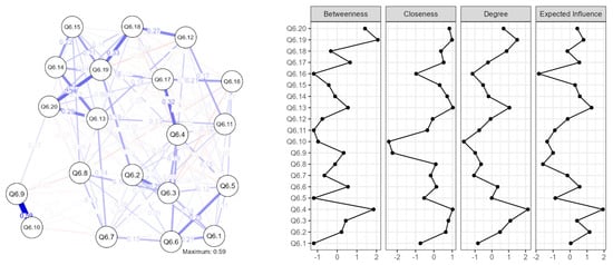 Betweenness measures the extent to which a variable lies on the shortest path between other variables in the network. The negative value for Q6.1, Q6.5, Q6.11, and Q6.16 indicates that these items were less important in connecting other items in the network. On the other hand, the higher positive value for Q6.4, Q6.19, and Q6.20 suggests that these items played a crucial role in connecting other items in the network.