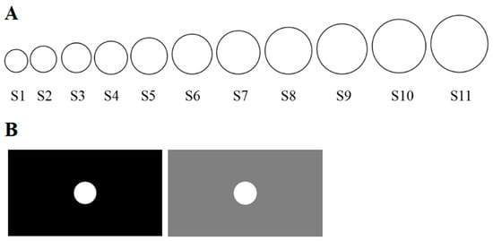 The experiment was run on a computer using EPRIME 2.0. The CS and GS were 11 circle stimuli of different sizes (Figure 2A). The smallest circle had a diameter of 5 cm, while the largest one’s diameter was 12.5 cm. The other circles progressively increased in diameter by 15% from smallest to largest. We chose two different backgrounds, black and gray, to provide two different contexts (Figure 2B).