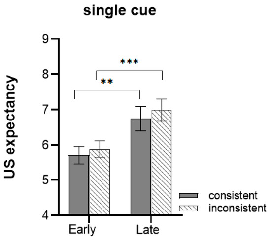 The mean unconditioned stimulus (US) expectancy ratings were higher for the late acquisition phase than the early phase. There was no significant difference between the two types of context groups. Error bars represent one standard error of the mean. *** p < 0.001, ** p < 0.01.