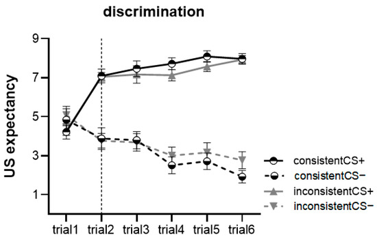 Figure 4 summarizes the results for the discriminative condition. The three-way mixed ANOVA was conducted with stimulus type (CS+, CS−) × trial (trial 1-trial 6) × context (consistent, inconsistent). Results showed a significant main effect of stimulus type, F(1, 47) = 127.852, p < 0.001, = 0.731, indicating that participants reported significantly higher US expectancy ratings for CS+ than for CS−. There was also a significant main effect of the trial, F(5, 43) = 8.169, p < 0.001, = 0.487, participants discerned differences in the type of CSs in trial 2. Moreover, there was a significant interaction effect between stimulus type and trial, F(1, 43) = 37.259, p < 0.001, = 0.812. We found no main effect of context, F(1, 47) = 0.016, p = 0.898, < 0.001, and no interaction with any other factors.