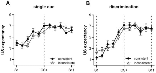 In the single cue condition, comprising both contextually consistent and inconsistent groups trained with a single cue, we examined the peak shift and found that participants had the highest mean US expectancy ratings for S9, with a significant difference compared with S1 (t(49) = 6.918, p < 0.001, Cohen’s d = 0.988) and S11 (t(49) = 2.107, p = 0.040, Cohen’s d = 0.301). We observed a generalization gradient with the peak at S9. There was no significant difference between S9 and CS+, t(49) = 1.284, p = 0.205, Cohen’s d = 0.183, and the evidence for peak shift was weak. Furthermore, the generalization gradient showed a significant linear trend, F(1, 48) = 52.173, p < 0.001, = 0.521, and a significant quadratic trend, F(1, 48) = 14.758, p < 0.001, = 0.235 (see Figure 5A).