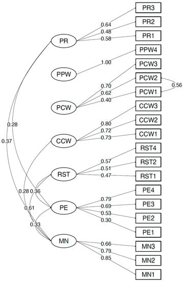 Fit indices for all tested models are shown in Table 3. Out of the nine tested models, three (model 3, model 6, and model 9) had an acceptable fit as indicated by non-significant χ2 statistic, CFI ≥ 0.95, TLI ≥ 0.95, RMSEA ≤ 0.05, and SRMR ≤ 0.08. Of these three acceptable models, model 6 (see Figure 1) was retained as the final model as it (1) excluded two items with very low factor loadings; (2) had the lowest χ2, AIC, BIC, RMSEA, and SRMR values; and (3) had CFI and TLI values ≥ 0.95. The final model, presented in Figure 1, included 7 factors, 20 items, and 1 error covariance between PCW1 and PCW2. All factor loadings were significantly different from 0 and were ≥0.30 (see Table 6), inter-item correlations ranged from 0.10 to 0.50, and inter-factor correlations ranged from 0.001 to 0.613. There were several significant inter-factor correlations. MN was positively correlated with PR (r = 0.37, p < 0.05), CCW (r = 0.28, p < 0.01), RST (r = 0.61, p < 0.01), and PE (r = 0.33, p < 0.01), while PE was positively correlated with PR (r = 0.28, p < 0.05) and RST (r = 0.36, p < 0.01) and negatively correlated with PPW (r = −0.26, p < 0.05).