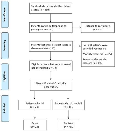 Of the 210 older adults enrolled at the two fitness centers, 142 were contacted by telephone. Of these, 32 refused to participate in the study, and 38 were excluded because of physical mobility problems and major CVD; 72 participants were finally included in this study. In total, 24 falls were reported during the 12-month observation period, representing the case group; 48 control participants were selected (Figure 1). The case and control groups were matched by age, sex, and assessment site (centers).